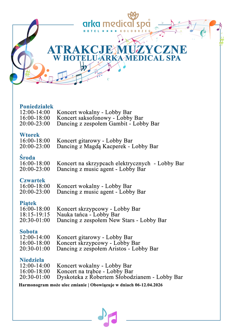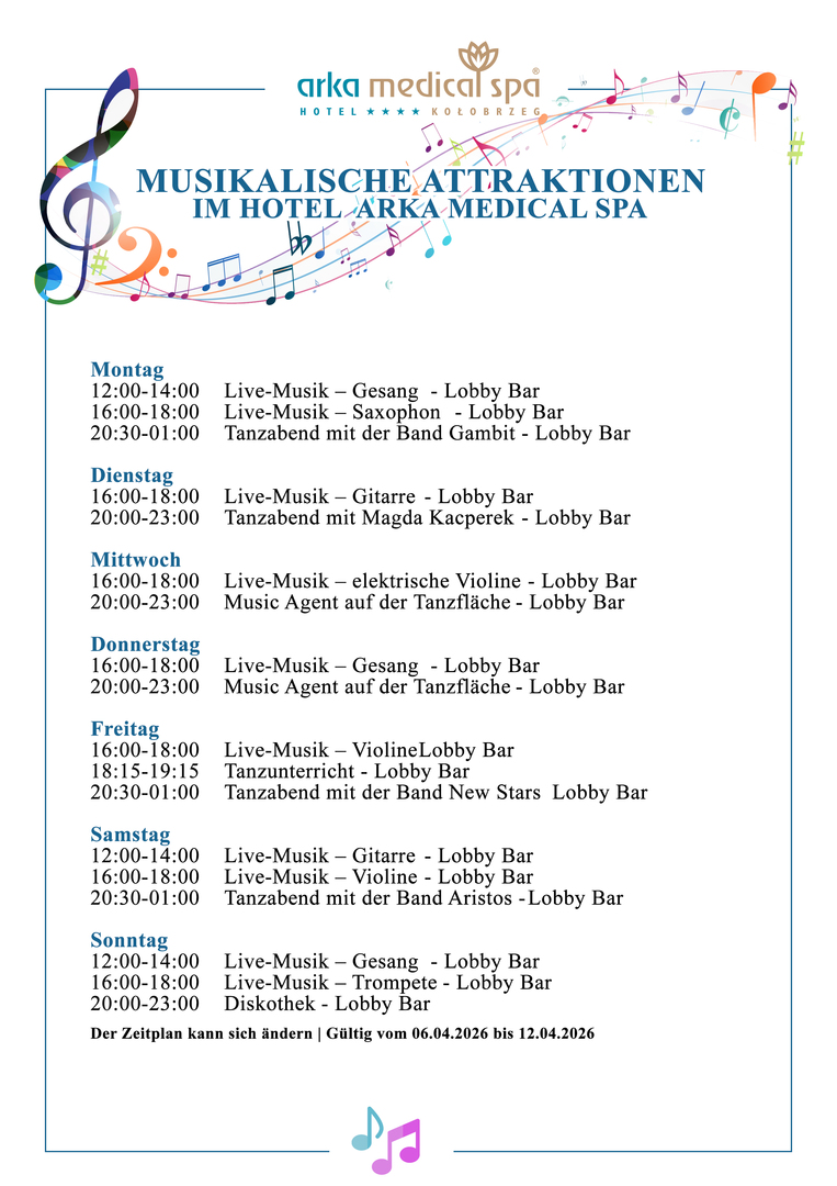 V Arka Medical SPA se pravidelně konají koncerty a hudební akce, které doplňují odpočinek a vytvářejí jedinečnou atmosféru pobytu. Komorní vystoupení, večery s živou hudbou a speciální umělecké akce dávají každému pobytu zvláštní charakter. Je to ideální kombinace relaxace, emocí a zábavy – jak pro hosty hledající klidné večery, tak pro ty, kteří ocení hudební akcenty během dovolené. Podrobnosti o aktuálních akcích jsou k dispozici na místě.