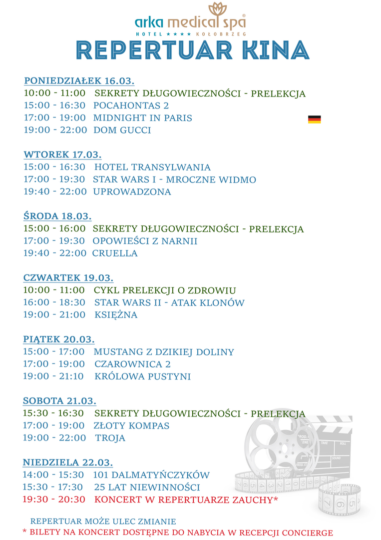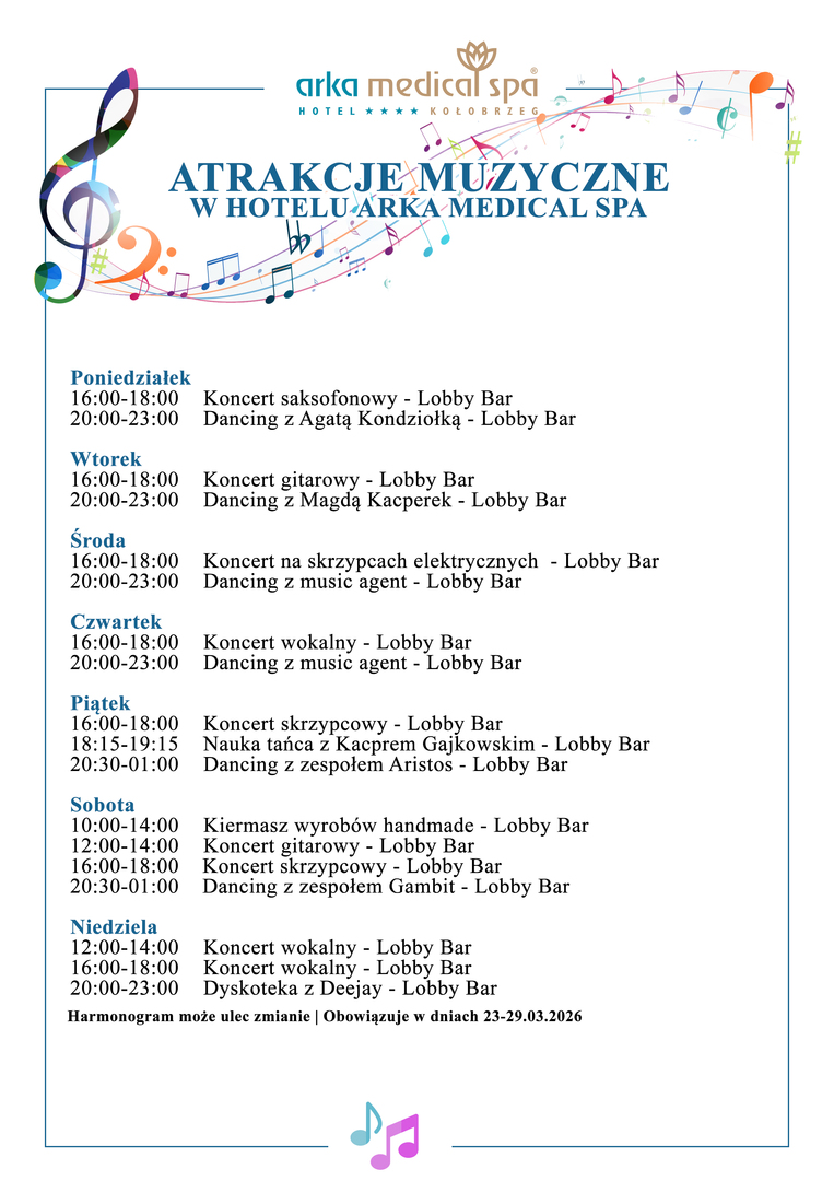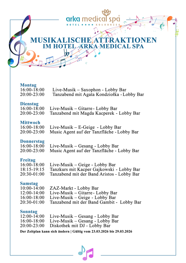 Im Arka Medical SPA finden regelmäßig Konzerte und Musikveranstaltungen statt, die den Aufenthalt bereichern und eine besondere Atmosphäre schaffen. Intime Auftritte, Abende mit Live-Musik sowie spezielle künstlerische Events sorgen dafür, dass jeder Aufenthalt eine zusätzliche Note erhält. Es ist die perfekte Kombination aus Entspannung, Emotionen und Unterhaltung – sowohl für Gäste, die ruhige Abende suchen, als auch für diejenigen, die musikalische Akzente während ihres Aufenthalts schätzen. Details zu aktuellen Veranstaltungen sind vor Ort erhältlich.