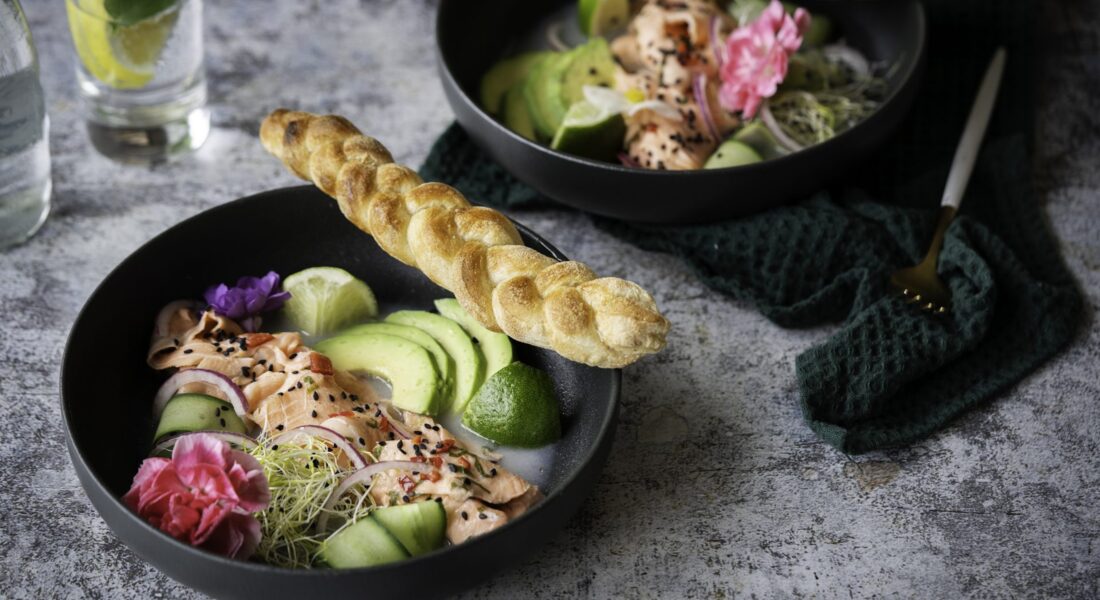 Klasyczna sałatka z chrupiącą sałatą rzymską, grzankami, parmezanem i sosem Cezar, z dodatkiem grillowanego kurczaka/krewetek/ sera halloumi, serwowane z warkoczem z ciasta pizzy.