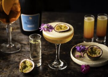 Wódka waniliowa, passoa, prosecco, sok z limonki, puree marakuja