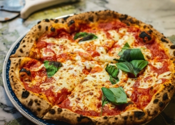 Sos czosnkowy, mozzarella, biała cebula, boczek wędzony, mix grzybó, koperek, wino czerwone